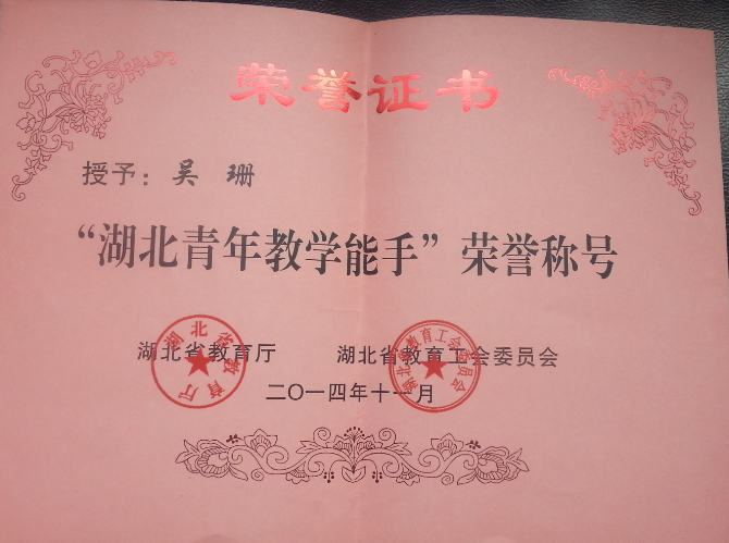 吴珊荣获湖北省第四届高校青年教师教学比赛三等奖