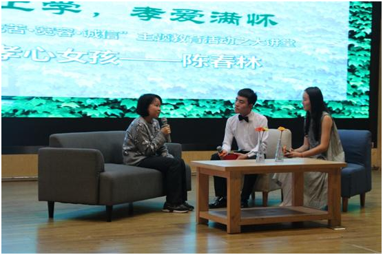 在介绍完嘉宾和领导后,一场精彩的访谈《背父上学 孝爱满怀》正式开始。在主持人请出主人公陈春林之前,我们通过短片了解到陈春林来自广西壮族自治区贺州市钟山县清塘镇英家村,在她9岁时,母亲因脑溢血离开了她;在她15岁时,父亲因中风偏瘫,陈春林和小她一岁的弟弟不知所措。从那一刻起,她选择了坚守,和弟弟两人一起承担家里的重担。为了生活和照顾生病的父亲,14岁的弟弟远去广东打工挣钱养家,陈春林则休学一年照顾父亲,生活的残酷并没有摧毁她,重返学校学习的梦想从未被阻挡,她经常抽出时间来学习,随着社会各界纷纷涌来的帮助,陈春林得以重返校园,在她的努力下,今年她以高出当地一本线70多分的成绩被华中师范大学录取。