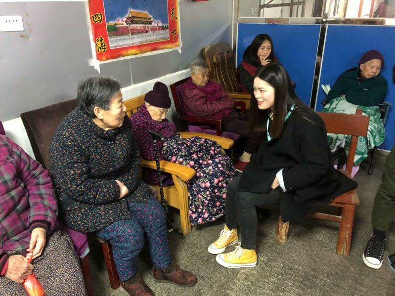 (图为:志愿者们陪老人聊天)
