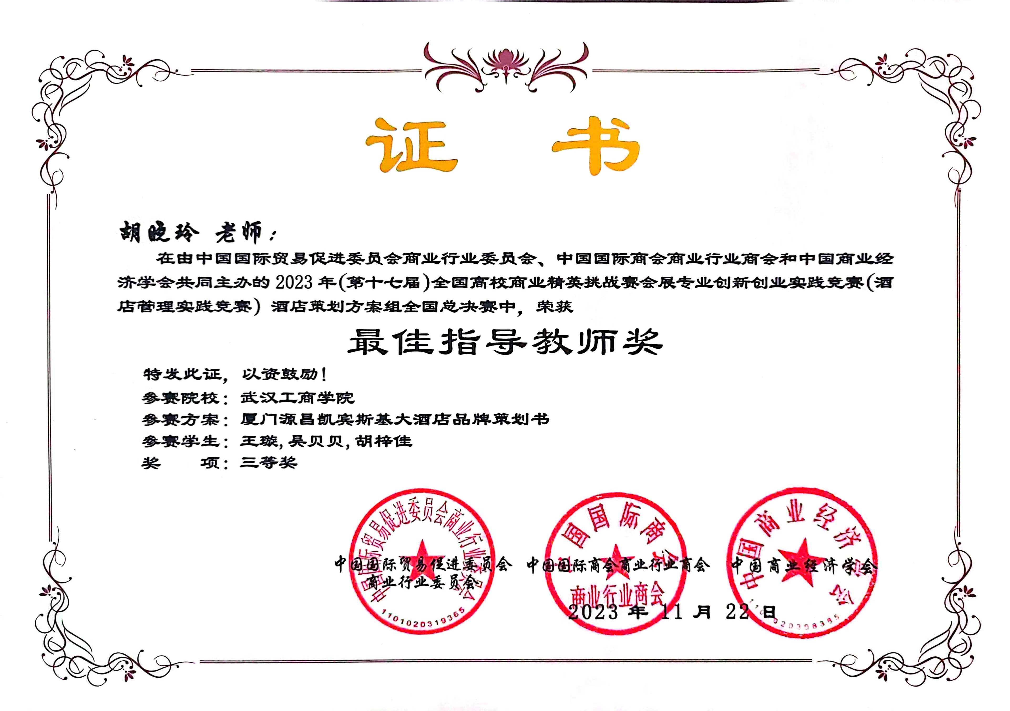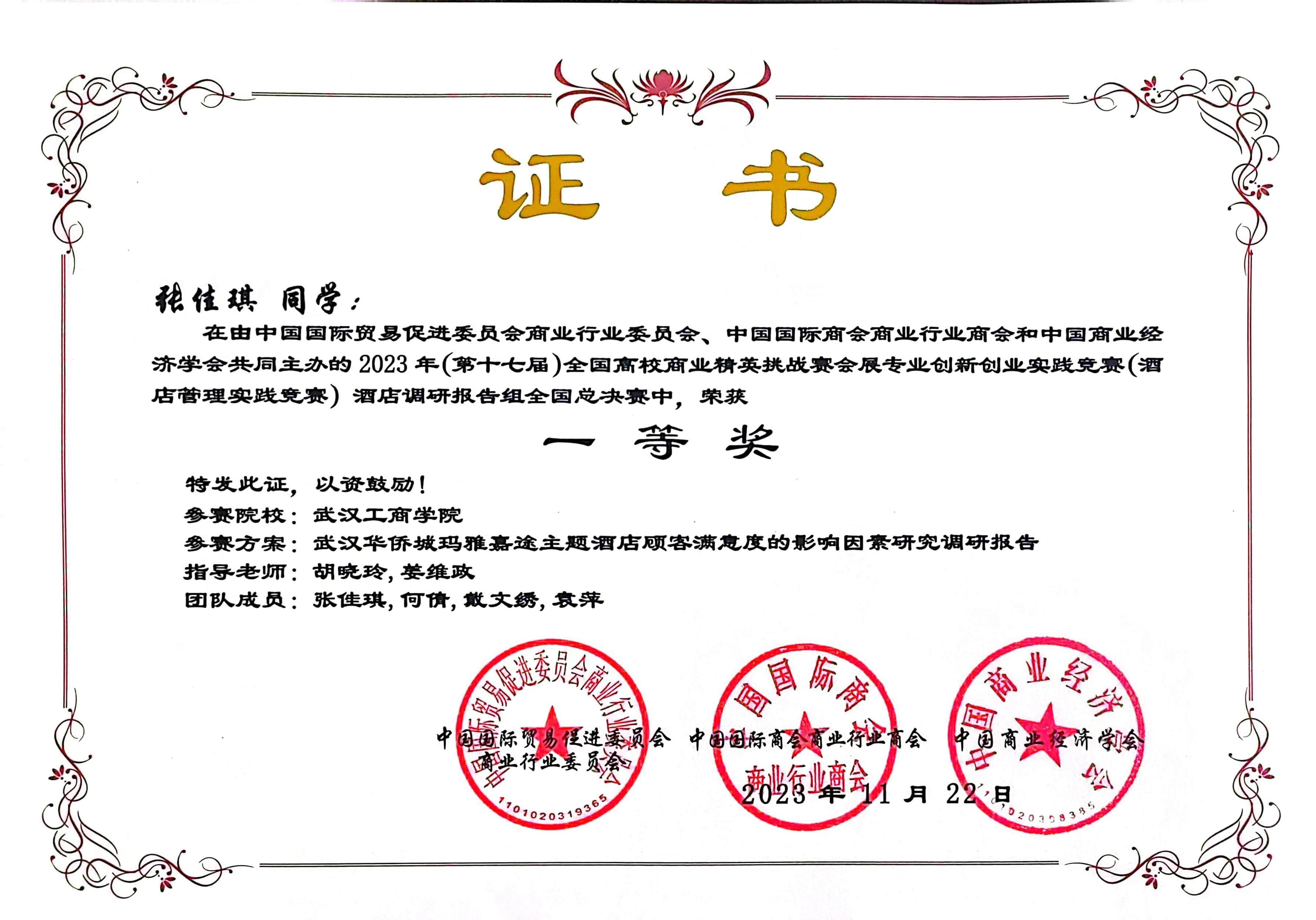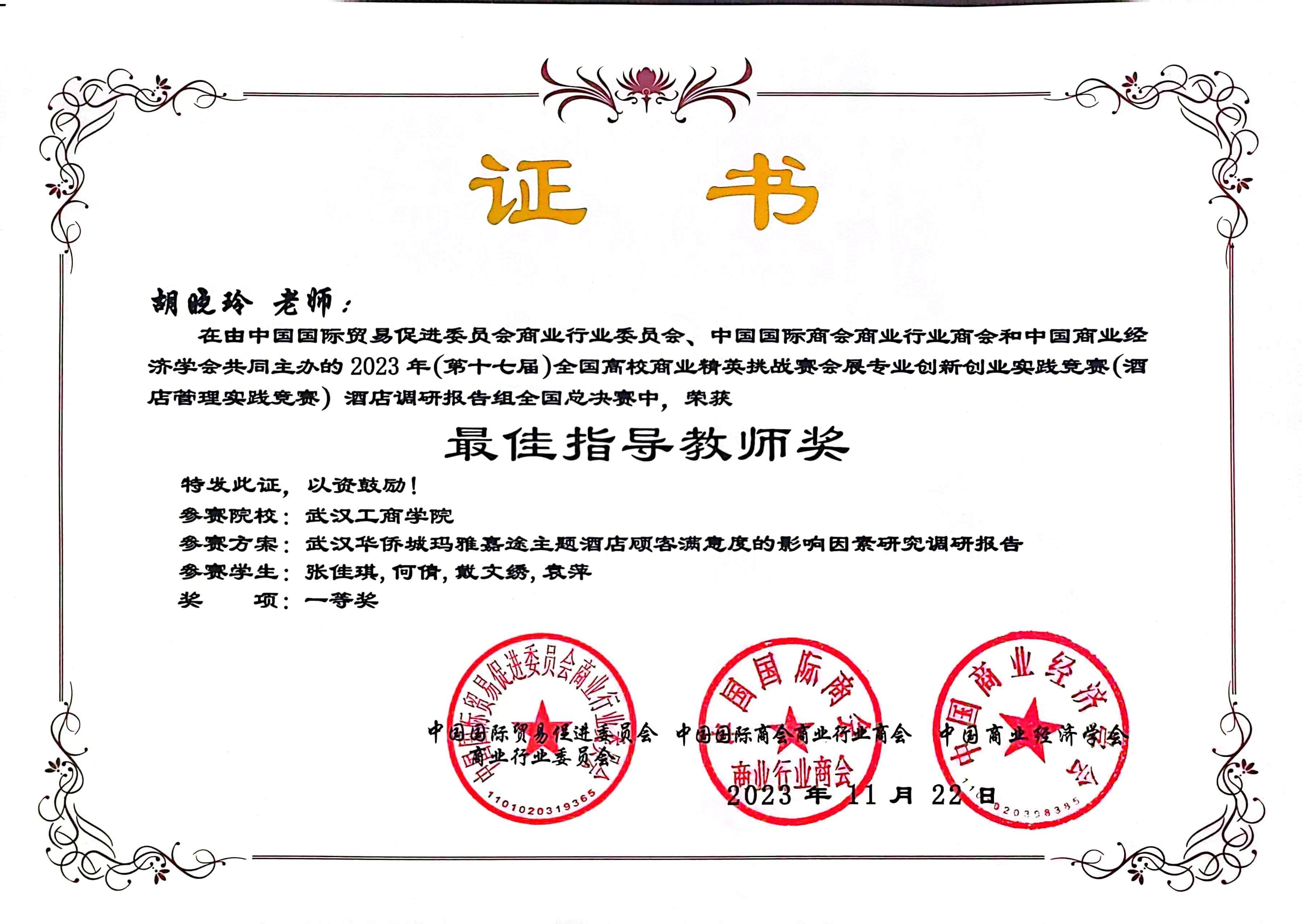 2023年11月,在第十七届全国商业精英挑战赛会展专业创新创业实践竞赛(酒店管理实践竞赛)中,由我院教学院长邵晓晖教授和旅游管理专业系主任胡晓玲副教授指导,我院本科生王璇、吴贝贝、胡梓佳组成的三朵小红花小分队获全国总决赛三等奖;由我院旅游管理系系主任胡晓玲副教授和旅游管理系姜维政老师指导,我院本科生张佳琪、何倩、戴文绣、袁萍组成的四大金刚队获全国总决赛一等奖;开云kaiyun官网管理学院荣获最佳组织奖。