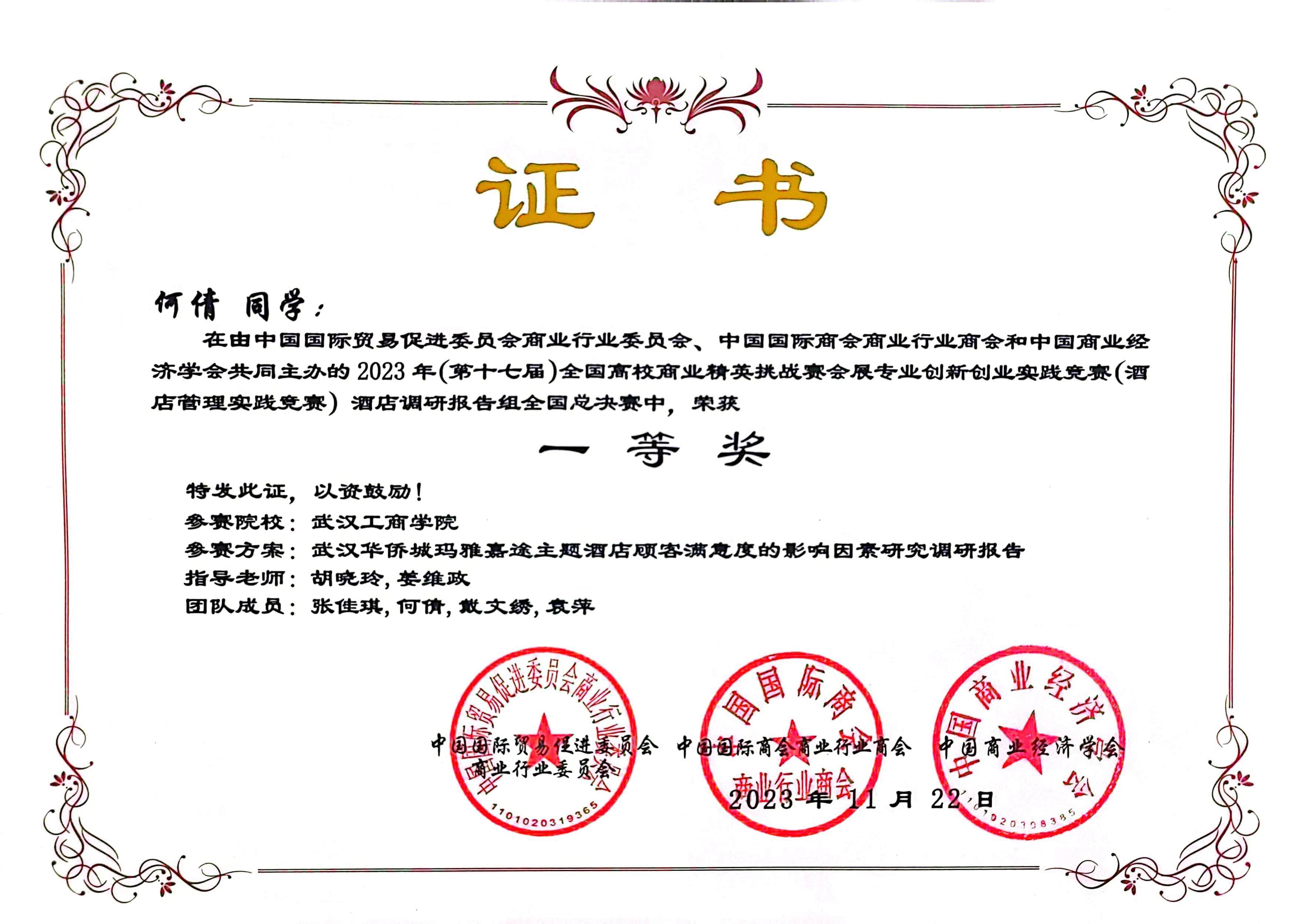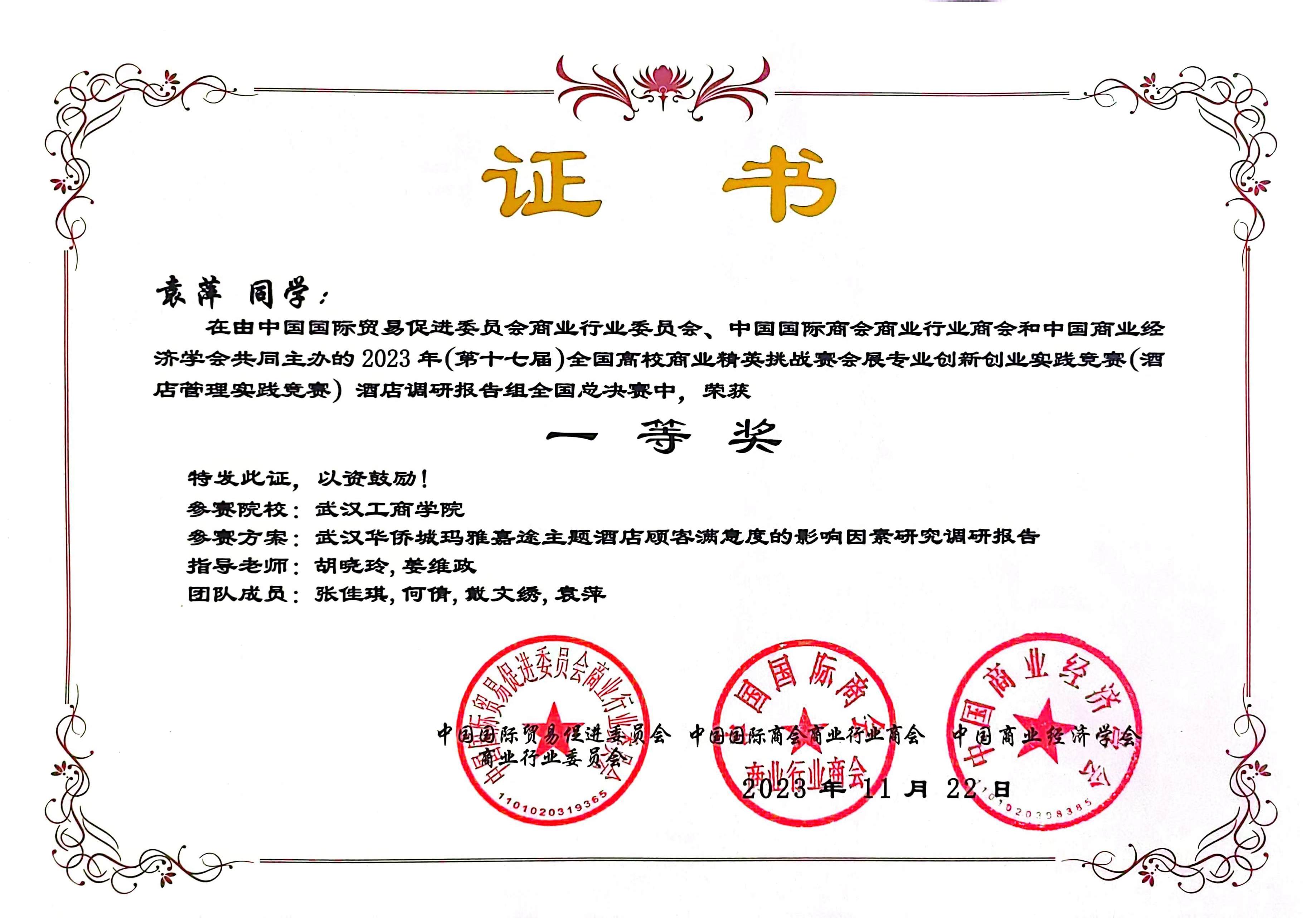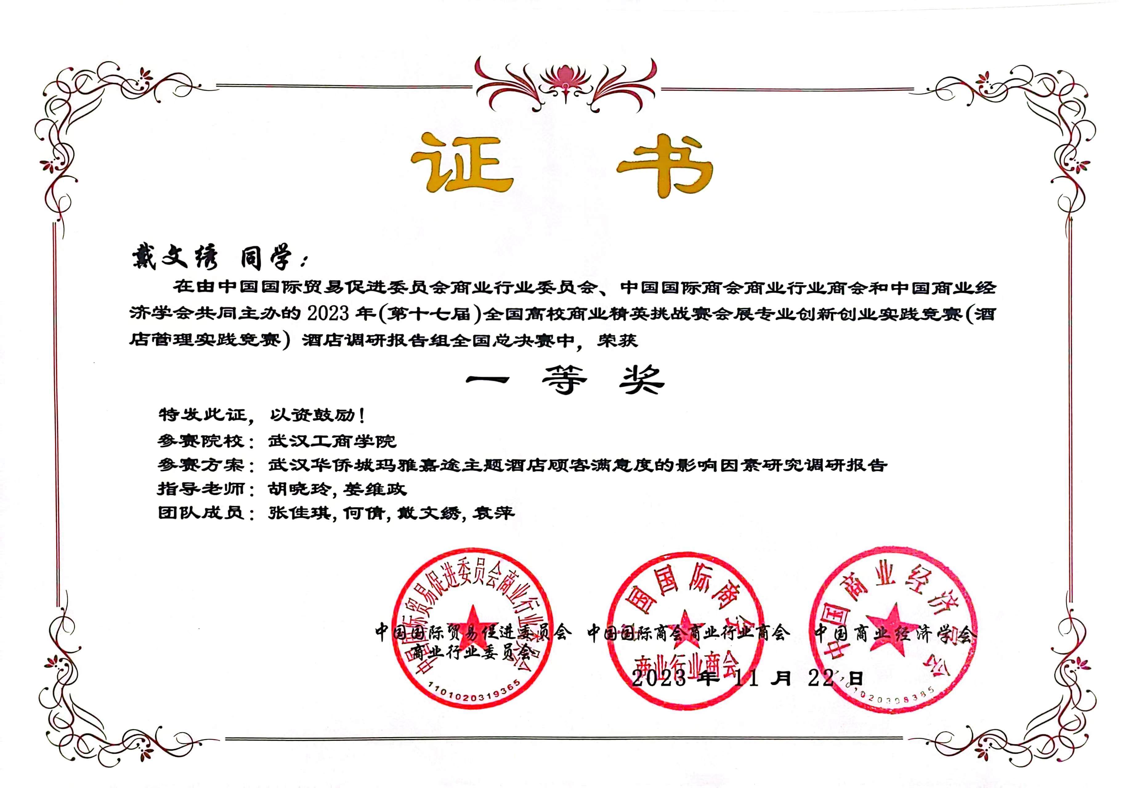2023年11月,在第十七届全国商业精英挑战赛会展专业创新创业实践竞赛(酒店管理实践竞赛)中,由我院教学院长邵晓晖教授和旅游管理专业系主任胡晓玲副教授指导,我院本科生王璇、吴贝贝、胡梓佳组成的三朵小红花小分队获全国总决赛三等奖;由我院旅游管理系系主任胡晓玲副教授和旅游管理系姜维政老师指导,我院本科生张佳琪、何倩、戴文绣、袁萍组成的四大金刚队获全国总决赛一等奖;开云kaiyun官网管理学院荣获最佳组织奖。
