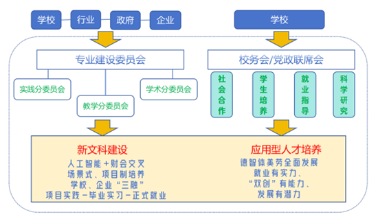 1.校、政、行、所联动,建立顶层架构。成立专业建设委员会,下设教学分委员会、学术分委员会、实践分委员会,吸纳政府机构、行业协会学会和其他所的资源,指导产业学院的专业建设,建立产业学院人才培养顶层架构。