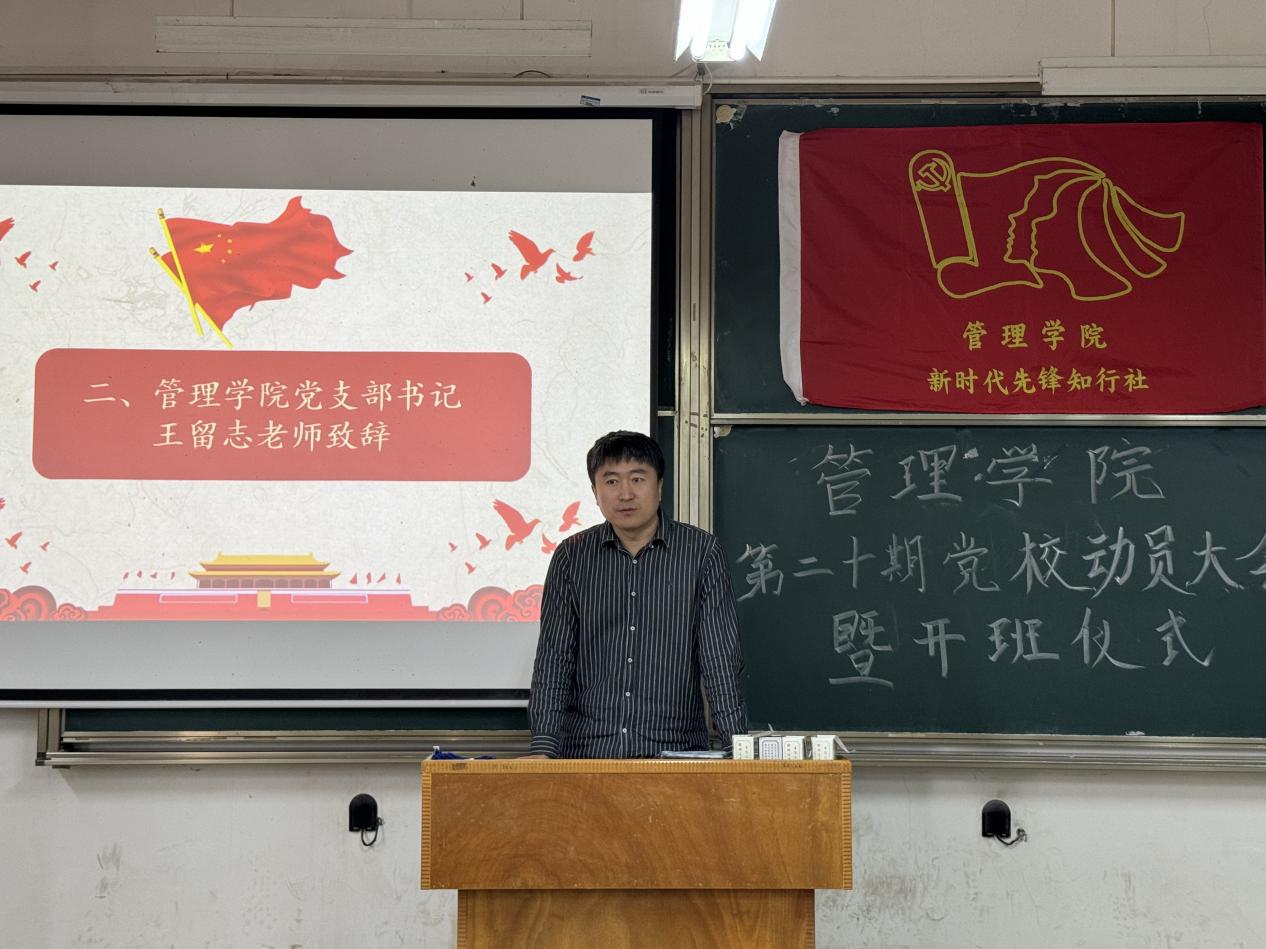 在大家热烈的掌声欢迎下,管理学院党支部书记王留志老师上台致辞。王留志书记的所言之中无不是对同学们的关切,并且就入党校学习对学员提了几点期望,大概介绍了党校任务,希望各位学员可以认真对待,深入了解党的使命与任务,提升自身政治思想觉悟,听党话,跟党走,向党靠近。