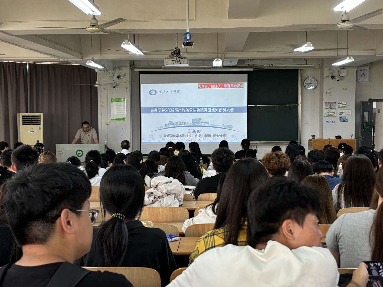 为推进一流应用型民办本科高校建设,实现本科教育教学高质量发展,培养行业拔尖创新人才,我院于10月18日下午在综合407召开“2024级产教融合CPA精英班组班动员大会”。合和(武汉)会计师事务所(特殊普通合伙)法人代表、首席合伙人涂义斌、管理学院常务副院长聂新田教授、智能会计系主任管威副教授、智能会计系副主任朱逢念副教授、刘少田讲师以及2024级会计本科全体学生、带班班主任、辅导员参加了本次大会。