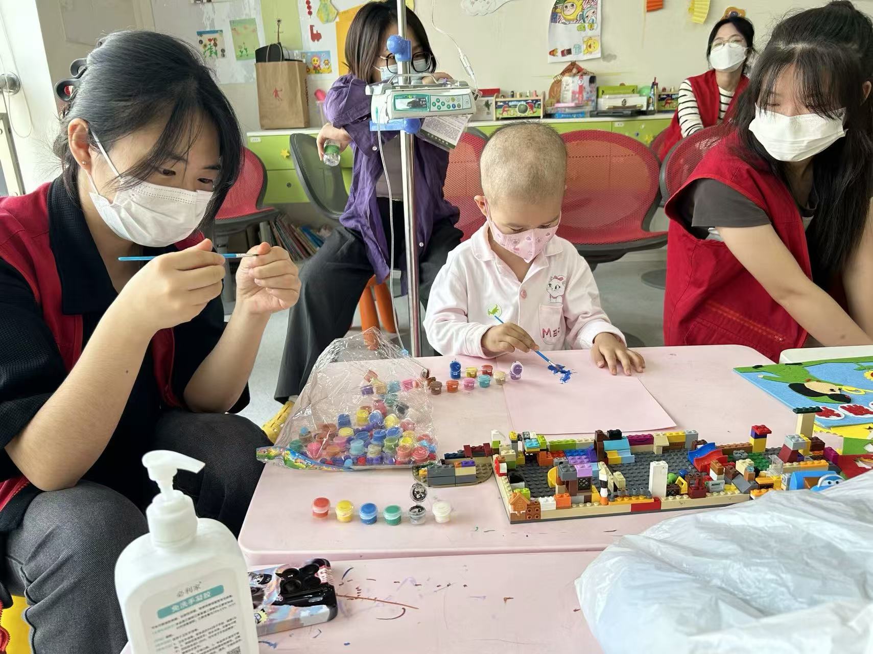 图为志愿者陪患儿做手工