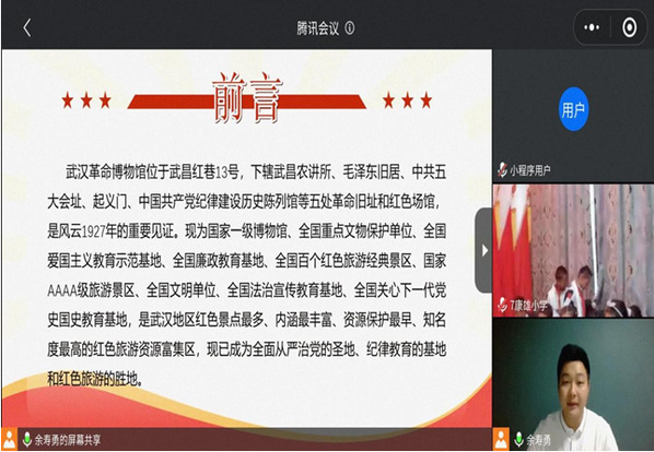 “火凤凰”社会实践队队长余寿勇曾在2019年暑假前往西藏开展支教服务,他在会上以图文并茂的形式介绍了武汉的一些红色教育基地以及背后的党史故事。他激动地说:“如今,我们青年大学生应该继承先辈的光荣传统,克难攻坚,努力进取,为全面建成小康社会,实现中华民族伟大复兴的中国梦而努力奋斗。”