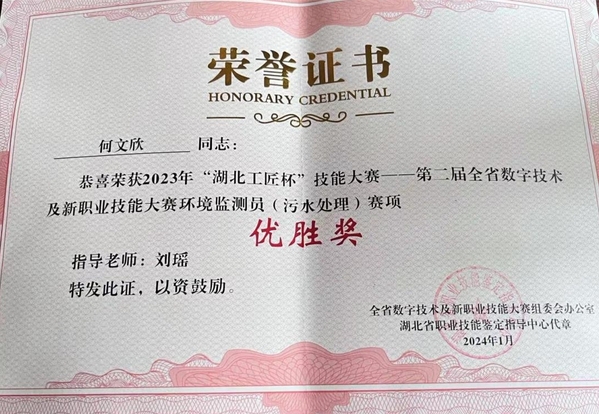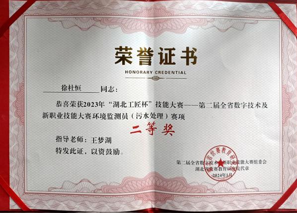 新闻中心讯(特约记者 郑丹)近日,环生学院21级环境工程专业4班徐杜恒和何文欣同学分别获得“湖北工匠杯”技能大赛——第二届全省数字技术及新职业技能大赛组委会颁发的环境监测员(污水处理)赛项的二等奖和优胜奖。他们的出色表现为学院赢得了荣誉,也为学生树立了榜样。