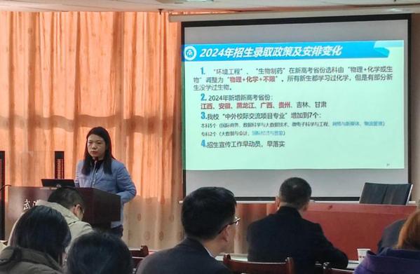 随后,招生办公室主任梅归归从三个方面详细阐述了2024年环生学院招生工作的重要事项:一是2024年环生学院的招生目标任务,依据分数线排名、新生报到率、生源推荐率、生源质量四个指标明确了招生工作的总体要求和预期目标;二是对部分招生工作安排进行了详细说明,包括新高考必选科目变化、新增高考省份、中外校际交流项目专业变化等;三是对招生奖励方案进行了全面介绍。