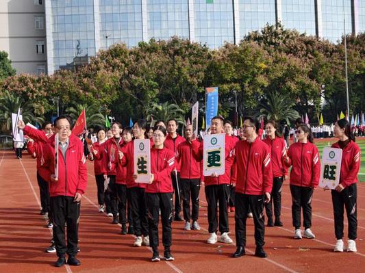 紧随其后的教师方阵同样令人瞩目,他们身着统一服装,精神抖擞。“环生更旺,勇争第一!”的口号响彻运动场,手中的牌子拼出鲜明字样,充分展现了我校教师队伍朝气蓬勃、锐意进取的精神风貌。