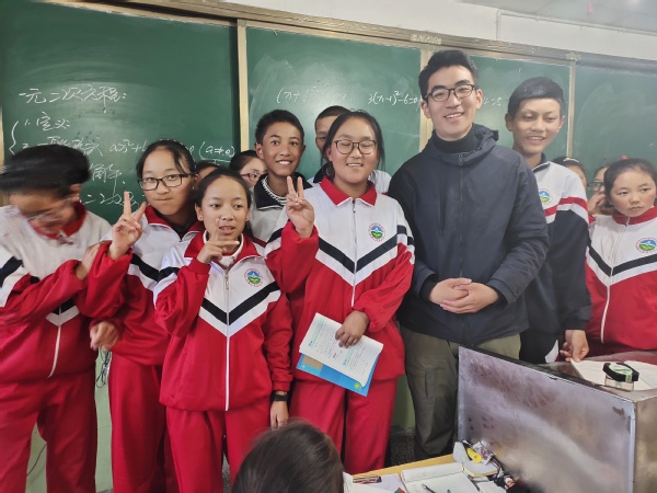学生党员朱家乐参加火凤凰支教与藏族学生一起合影
