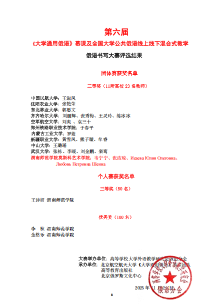 近日,第六届全国大学俄语书写大赛圆满落幕。今年会莫斯科艺术学院选派优秀学生代表参赛,凭借扎实的语言功底和出色的书写表现,最终荣获团体赛三等奖。个人赛中,共斩获个人赛三等奖1名、优秀奖2名。