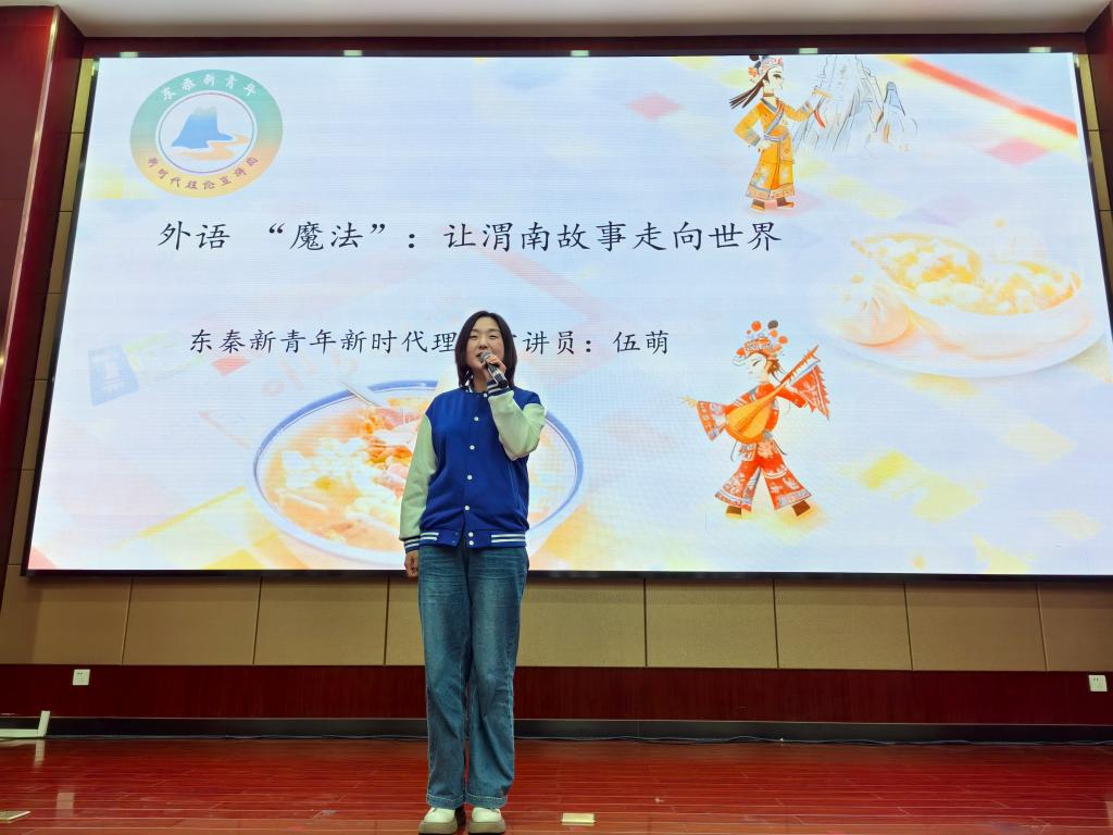 宣讲中,伍萌以《外语“魔法”:让渭南故事走向世界》为题,以党的二十届四中全会精神为指引,结合外语专业特色与育人实践,分享渭师学子在乡村支教中播撒语言种子、在“用外语讲好中国故事”专栏中深挖渭南文化、在外事志愿服务活动中传递渭南城市温度,生动诠释了渭师学子如何以专业所长践行“扩大高水平对外开放”“提升中华文明传播力影响力”的时代要求,展现渭师人扎根渭南、深耕教育的责任担当。