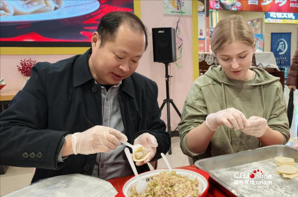 案板前,来自俄罗斯、塔吉克斯坦等国家的留学生围成一圈,学着擀皮、包馅。有人动作生疏,小心翼翼地捏着饺子边;有人已经渐渐熟练,一个个饺子摆得有模有样。空气里弥漫着面香,也多了几分节日的温度。