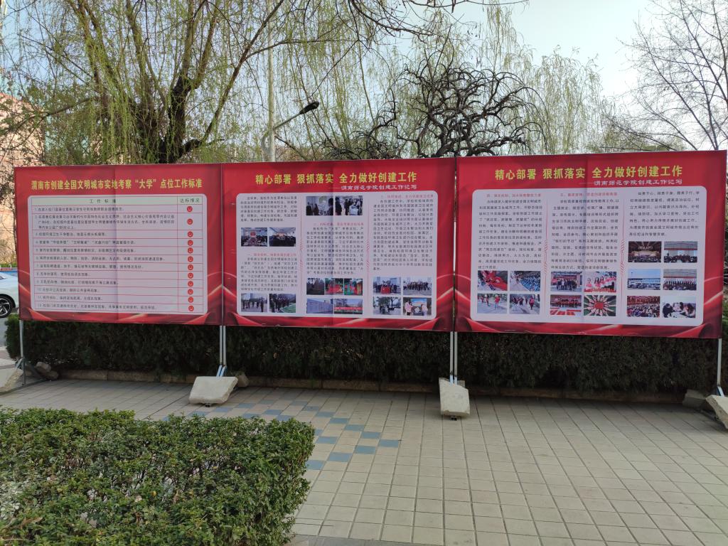 作为“大学”考察点位,学校严格按照创建全国文明城市实地考察点位工作标准要求,从学生守则、教师职业道德规范展示,习近平新时代中国特色社会主义思想、社会主义核心价值观、文明健康绿色环保生活方式等公益宣传,整洁校园环境卫生,校园禁烟宣传教育,消防设施配备,无障碍设施通道保障,维护校园交通秩序等方面对标对表、高质量落实“大学”考察点位创建各项工作任务。