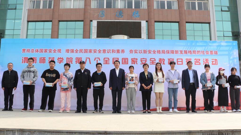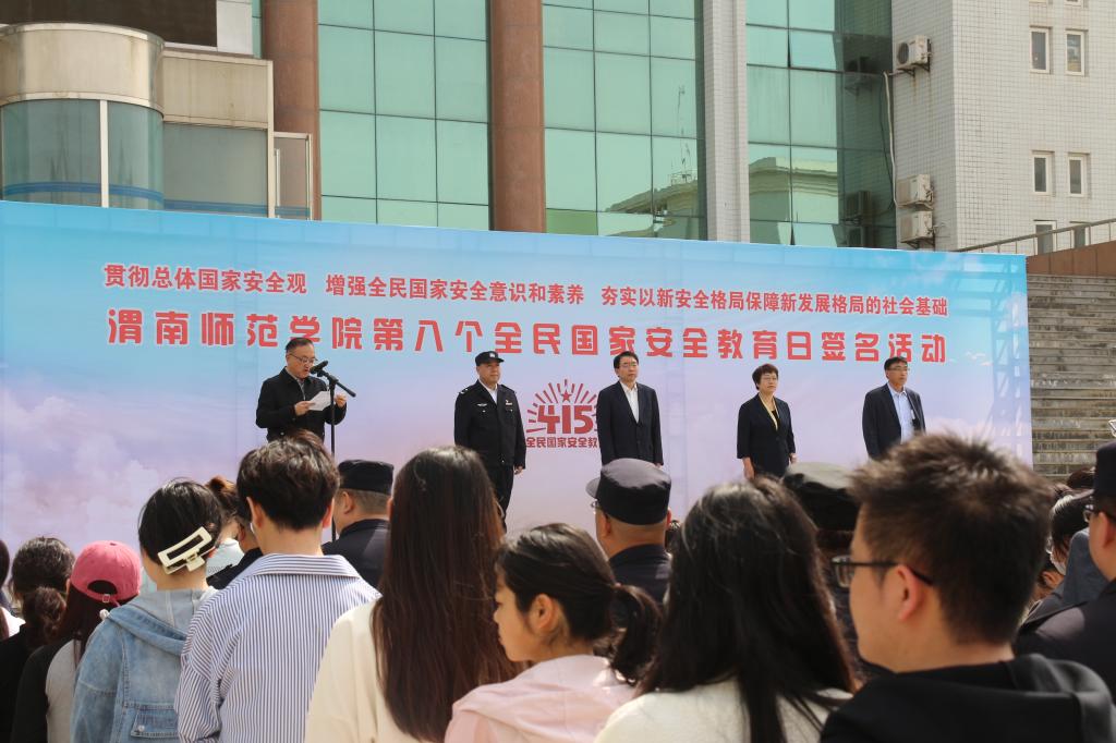 4月12日下午,学校联合渭南市公安局等相关单位,在朝阳校区举办第八个全民国家安全教育日签名活动。渭南市公安局党委委员、副局长宁双喜,今年会校长张守华,党委副书记韩小卫、袁亮等出席活动。