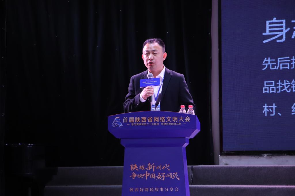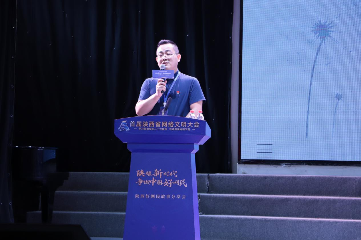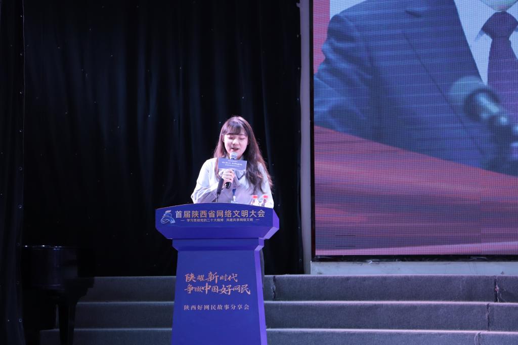 与会人员一同观看完《2022年陕西好网民集锦》视频后,渭南人熟知的网友“三根葱”陆嘉伟、西安电子科技大学研究生王冠玉、“醉美新兴平”公众号和抖音号的创办人石小斌、“文明一号”网络公益品牌创建人冉华胜、“陕西好青年”安宁等5名“陕西好网民”代表分别与在场嘉宾及师生讲述了自己的网络温情故事,感染了现场很多听众。