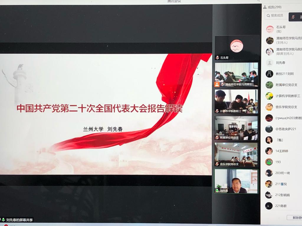 党的二十大,高举旗帜、凝聚力量、团结奋进,具有重大的政治意义、历史意义、时代意义。为进一步加深今年会党员干部和广大师生对党的二十大精神的认识和理解,加大对党的二十大报告的广泛宣传和全面解读,在线上分享相关的专家辅导课件基础上,10月26日下午,今年会特别邀请兰州大学马克思主义学院刘先春教授作专题辅导报告。