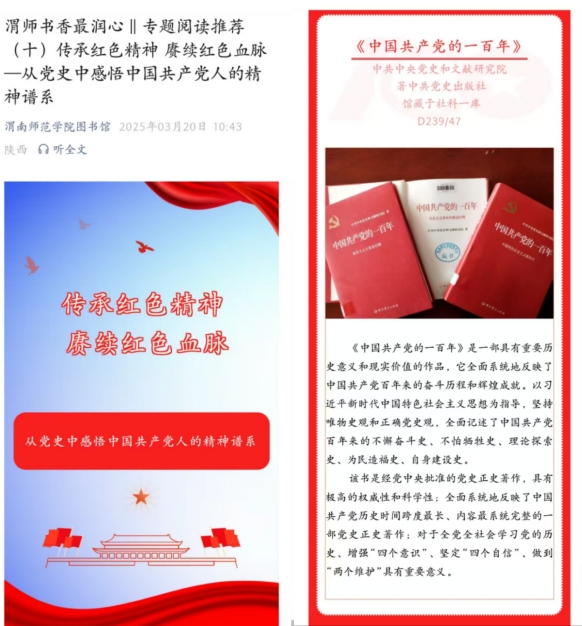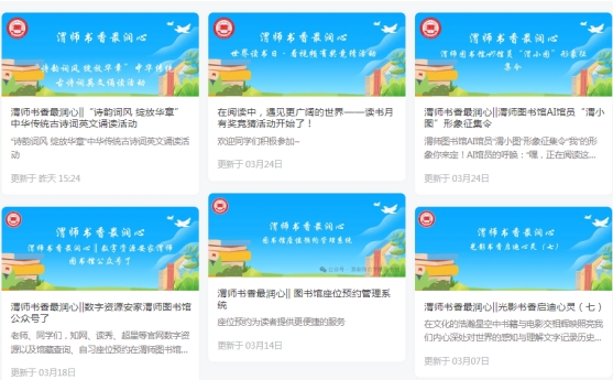 (二)培育“渭师书香最润心”思想文化特色品牌,依托图书馆公众号设有“名师荐书”“数字资源”“专题阅读推荐”“光影书香启迪心灵”栏目及丰富的阅读活动,助力“大思政”和校园文化建设。