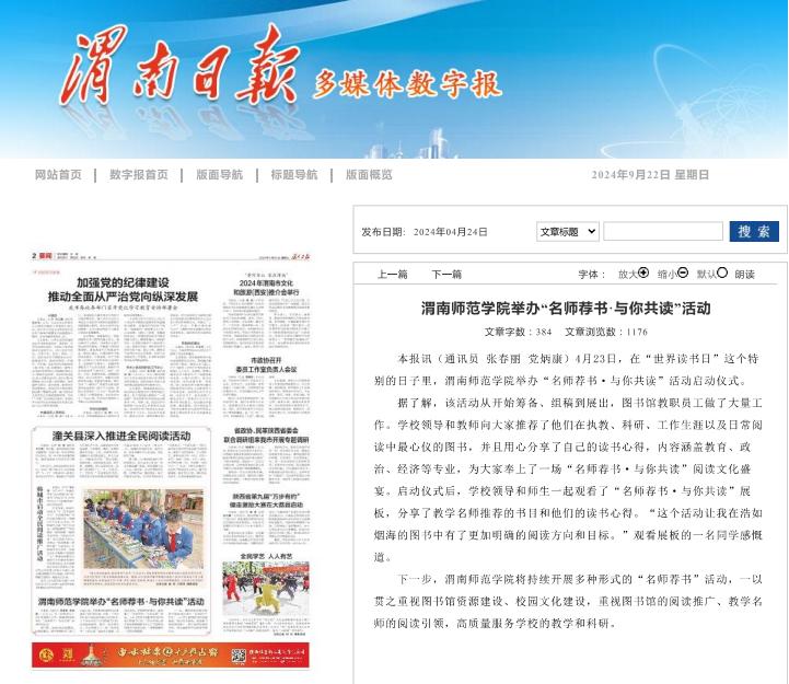 (六)宣传提质增效。图书馆十分重视宣传工作,2024年《今年会官方网站举办“名师荐书 与你共读”活动启动仪式》引起了强烈反响,被《学习强国》《渭南日报》、新浪财经报道、学校官网、学校视频号报道;《深化全民阅读 建设书香校园》被渭南新闻网报道,被《渭南日报》微博转载;《“共沐书香美 共享阅读乐”读书笔记展》被《阳光报》报道。