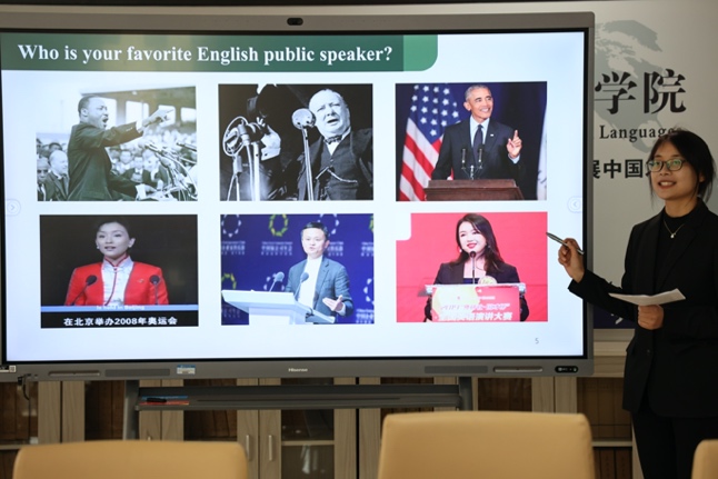随后,新教师徐晨以《英语演讲与辩论》课堂设计为例,将语言教学中的课堂活动组织、教学方法应用、教学技术融入等的经验进行了分享。本次示范课聚焦于《演讲的艺术》教材第6章《支持你的观点》,徐晨老师邀请学生分享最喜欢的英语公众演讲者,展示国内外优秀英语公众演讲者图片,分析外研社国才杯演讲比赛获奖视频《圆桌》,重点讲解了如何使用例子和统计数据来支持演讲中的观点,并鼓励学生以实践所学知识并传播中国文化。徐晨老师着装得体,逻辑清晰,讲解详细,PPT图文丰富,有效地展示了英语演讲与辩论课程的教学方法和互动策略。