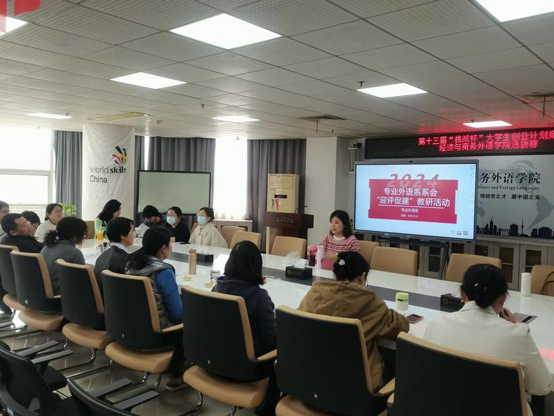 经济与商务外语学院新闻中心讯(通讯员 于文)为持续提升教师的教学能力和课程质量,2024年3月21日14:30,经济与商务外语学院专业外语系于综合楼920会议室召开“迎评促教”教研活动,此次活动由专业外语系新教师徐晨作为主讲人,参与此次活动的人员为经外学院专业外语系全体任课教师,此次活动由专业外语系系主任黄净教授主持。