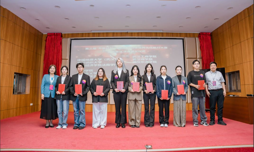 经济与商务外语学院新闻中心讯(记者:徐无名)2024年10月13日,第三届“外教社杯”全国高校学生跨文化能力大赛湖北赛区决赛在湖北工业大学圆满落幕。经济与商务外语学院英语专业2021级学生齐龙飞、杨容与王丽敏凭借出色的表现获得一等奖。