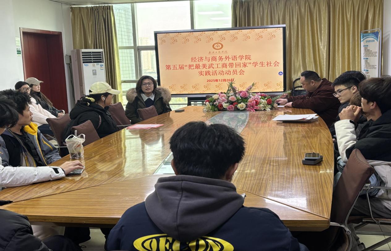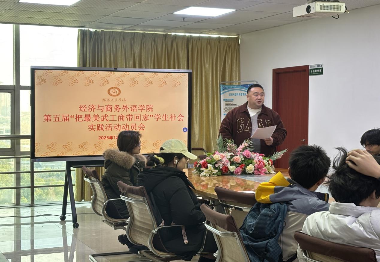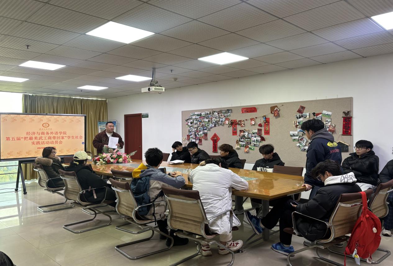 经济与商务外语学院新闻中心讯(记者:赵晓玉)为扎实推进第五届“把最美武工商带回家”学生社会实践活动落地,充分发挥学生在学校招生宣传中的桥梁作用,精准向高中母校推介开云kaiyun官网及经济与商务外语学院办学优势,2025年12月26日,学院在综合楼921会议室召开专项动员会。学院党总支书记胡航、活动负责老师张子菡老师出席会议,活动参与学生全体到会。会议由学院党总支书记胡航主持。