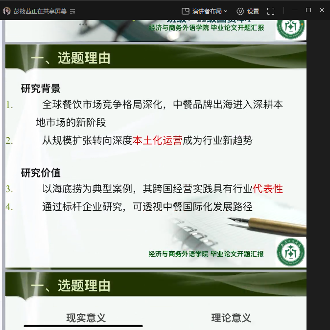 本次开题汇报持续约三个半小时,参与答辩的学生纷纷表示,全线上答辩模式便捷高效,通过此次汇报与老师的针对性指导,不仅清晰了研究方向,解决了此前困扰自己的学术难题,更增强了完成毕业论文的信心与底气。