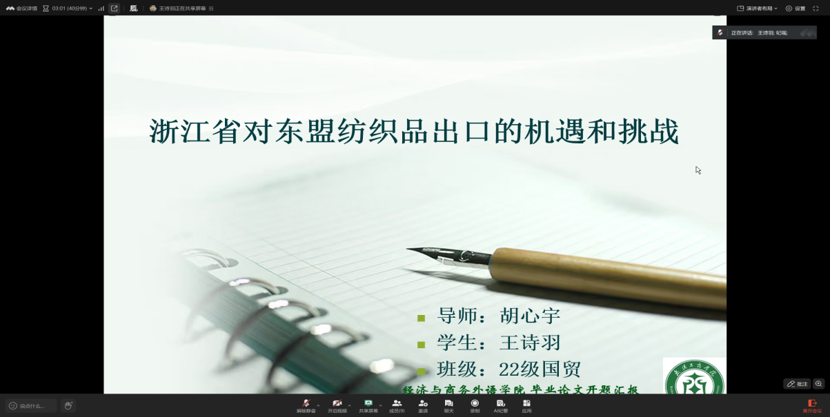 上午9时,汇报会正式启动。线上会场营造出严谨务实又不失活跃的学术氛围,学生们按照3-5分钟的时限,依次通过线上会议系统阐述选题初衷、研究价值、文献梳理情况、拟采用的研究路径及论文整体框架。从跨境电商供应链优化、RCEP协议下中小外贸企业发展路径,到数字经济赋能国际贸易转型、绿色贸易背景下农产品出口突破策略等选题,充分彰显了国贸专业本科学生立足行业前沿的学术视野与扎实的专业知识储备。