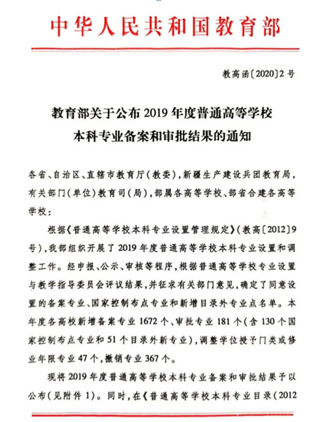 近日,教育部下发了《关于公布2019年度普通高等学校本科专业备案和审批结果的通知》(教高函[2020]2号),开云kaiyun官网申报的机器人工程、软件工程、艺术与科技3个新增本科专业,经过申报、公示、审核程序,顺利通过国家教育部批准,3个新增专业可从2020年起开始招生。