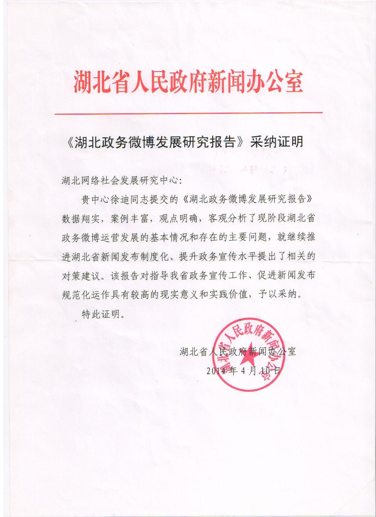 《湖北政务微博发展研究报告》采纳证明