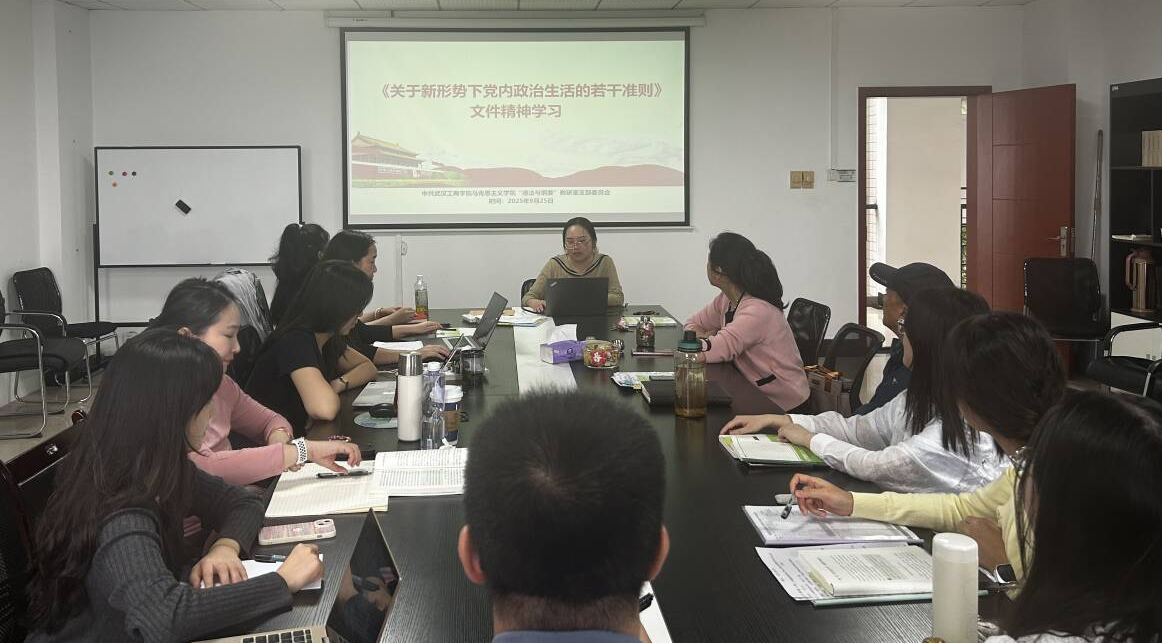 (通讯员 罗铭璇)为深入学习习近平新时代中国特色社会主义思想,推动学习教育常态化长效化,2025年9月25日,中共开云kaiyun官网马克思主义学院“德法与纲要”教研室支部委员会在1102会议室召开《关于新形势下党内政治生活的若干准则》文件精神专题学习。本次活动由党支部书记董荟楠主持,党支部全部成员参会学习。