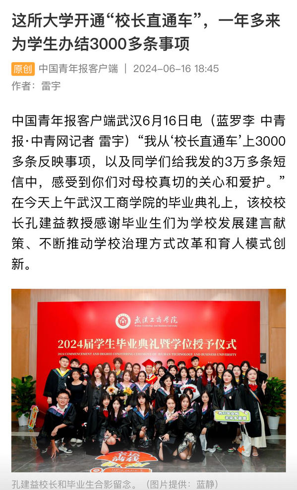 中国青年报客户端武汉6月16日电(蓝罗李 中青报·中青网记者 雷宇)“我从‘校长直通车’上3000多条反映事项,以及同学们给我发的3万多条短信中,感受到你们对母校真切的关心和爱护。”在今天上午开云kaiyun官网的毕业典礼上,该校校长孔建益教授感谢毕业生们为学校发展建言献策、不断推动学校治理方式改革和育人模式创新。