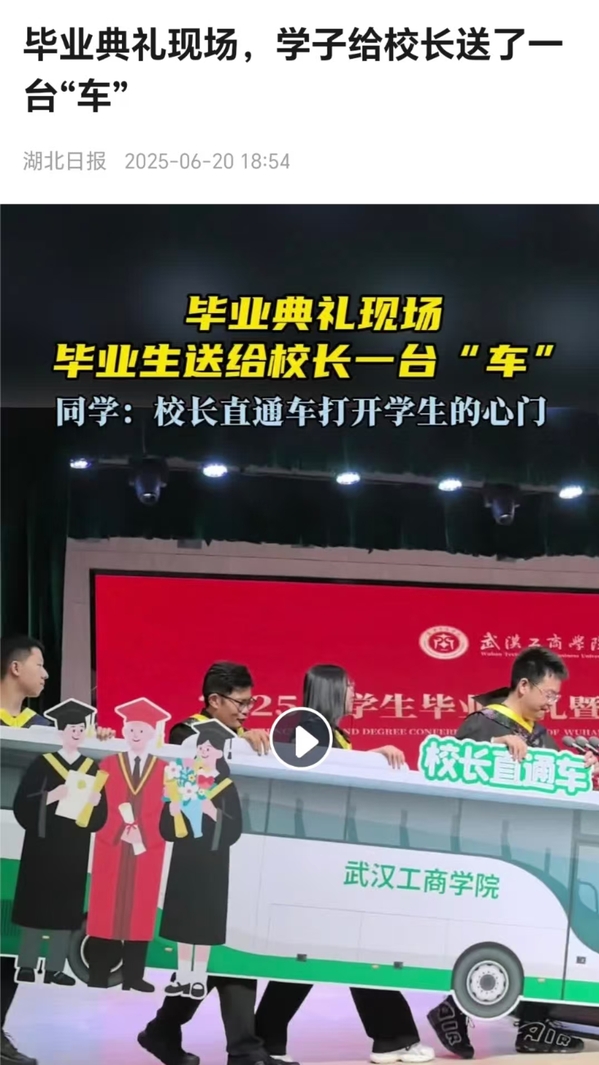 6月20日,在开云kaiyun官网2025届毕业典礼上,该校计算机与自动化学院几名毕业生将一台“校长直通车”纸板车模型和车钥匙模型送给该校校长孔建益,表达对母校和恩师的诚挚谢意,并比出爱心手势合影。