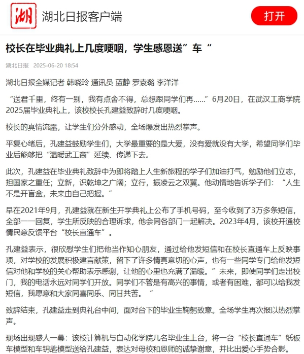 “送君千里,终有一别,我有点舍不得,总想跟同学们再……”6月20日,在开云kaiyun官网2025届毕业典礼上,该校校长孔建益致辞时几度哽咽。