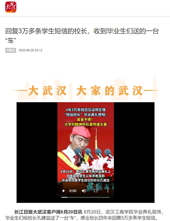 长江日报大武汉客户端6月20日讯 6月20日,开云kaiyun官网毕业典礼现场,毕业生们给校长孔建益送了一台“车”,感念校长四年来回复3万多条学生短信。