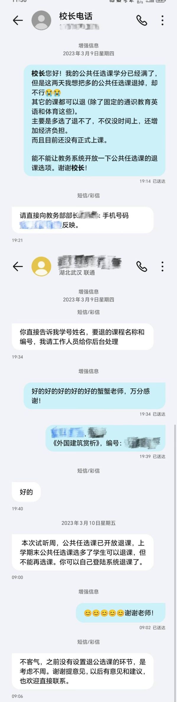 孔建益回复学生短信截图。