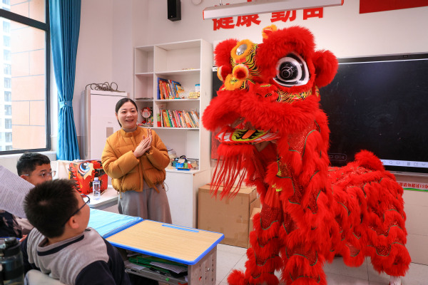 随后的舞狮表演将气氛推向高潮。由4名大学生扮演的两只“狮子”活灵活现,穿梭于课桌之间,孩子们笑声不断,纷纷上前与“狮子”亲密互动,现场气氛热烈。