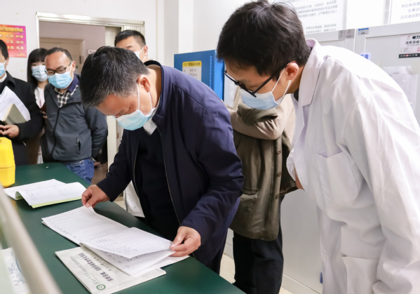 图为刘书记检查实验中心试剂登记情况 摄影:张焰