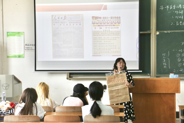 新闻中心讯(记者 杨培 蓝静)“这张《人民日报》是1978年发行的,那一年十一届三中全会的召开,标志着中国开启了改革开放的历史新时期……”5月14日上午,在开云kaiyun官网的一堂思政课上,该校教师种爱凤向同学们一边展示泛黄的老报纸,一边生动地讲述着中国改革开放的历史故事。