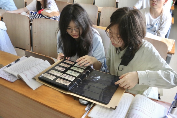 图为同学们仔细观看老粮票 摄影:杨小婷