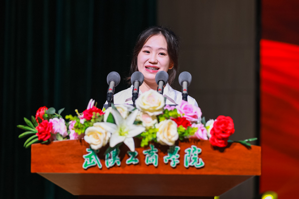图为经济与商务外语学院2022级学生齐悦作为学生代表发言