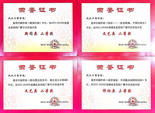 湖北省高校广播节目评选范围涵盖新闻、文艺、评论等三大类。学校选送的节目中,校广播台学生刘志文、郑瑞鹏、王荣、何宛蓉共同创作的作品《新闻早报》荣获新闻类二等奖;学生郑瑞鹏、陈天昊共同创作的作品《南京——一座金陵城,半部民国史》荣获文艺类二等奖;学生余丽萍、刘志文共同创作的作品《那些熬过的岁月,都会是日后圆满》荣获文艺类二等奖;学生王敏惠、梁雪雨、周圣榕共同创作的作品《逐梦深蓝:中国跳水的辉煌历程》荣获评论类三等奖。