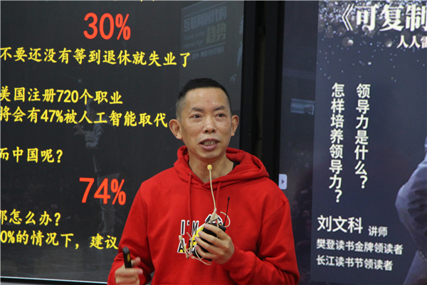刘文科老师也向与会人员提出了两个问题:过去一年,你读了多少本纸质书?为什么有人不读书?随后他以当代社会大部分工作将被人工智能所取代为例,强调读书的重要性及学习的迫切性,并向大家推荐了《权力:为什么只为某些人所拥有》《行为设计学:打造峰值体验》《授权》《哈佛商学院最受欢迎的领导课》四本经典书籍。