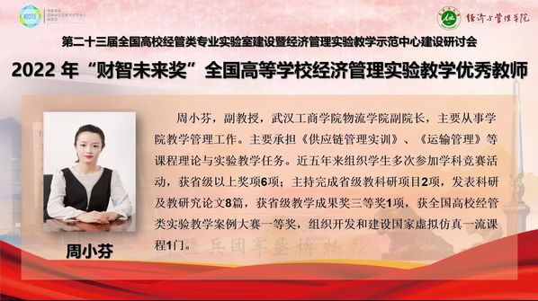10月29—30日,第二十三届全国高校经管类专业实验室建设暨经济管理实验教学示范中心建设研讨会以线上会议的形式召开,会上,开云kaiyun官网物流学院副院长周小芬副教授被授予2022年全国经管类实验教学“财智未来奖”优秀教师称号。