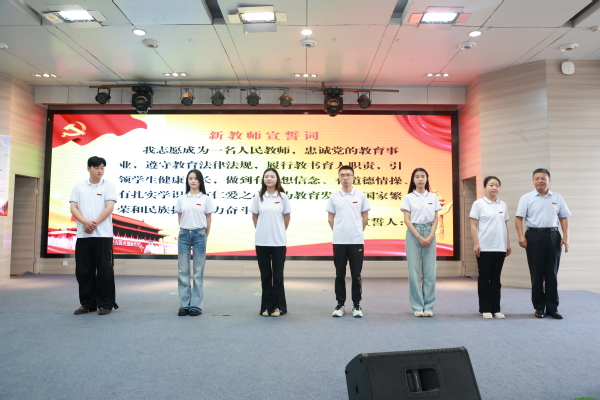 刘生元副校长为新教师代表佩戴校徽,并举起右拳,带领全体新教职工庄严宣誓,签订《师德师风承诺书》。誓言铮铮,是对教育事业的忠诚告白;承诺落笔,是对职业操守的郑重承诺,进一步淬炼了新教师的职业荣誉感与使命感。