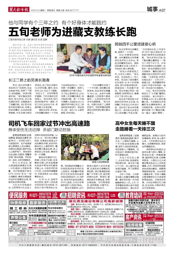 据张兆学讲,多年来,只有进藏支教前一个月他才会变身运动达人。“2012年第一次进藏时,就有人因高原反应不得不退出。”为了防止高原反应,2015年第二次进藏支教前,他开始练长跑,那一个月每日清晨5点他就从汉口头道街的家中跑过长江二桥来到徐东团结村,再坐校车上班,每日9.1公里的跑程,风雨无阻。“今年进藏前也练了一个月长跑,来到藏区医院体检,我血液的含氧量为92%(注:血液中含氧量越高,人的新陈代谢就越好),比和我同去的很多学生都要高。”张兆学说,长跑让他有了上高原的底气,而他带着克服高原反应的药物红景天都未曾用上。