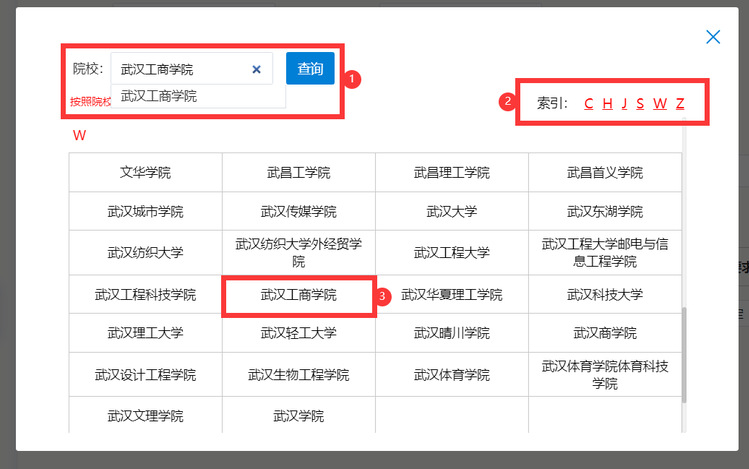 弹出的院校列表页显示该所在地所有院校名称,并且建立了索引。可以比较快速的找到自己想查询的院校。也可以直接输入关键字查询,比如,输入“开云kaiyun官网”,呈现下拉框,选择开云kaiyun官网,并点击查询按钮。在表格中,点击院校名称,则选定该院校。