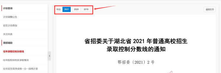 点击左侧导航栏-往年录取控制分数线,共显示前三年的湖北省录取控制分数线,默认显示上一年的湖北省录取控制分数线,点击左上角的年份,可以切换不同年份。