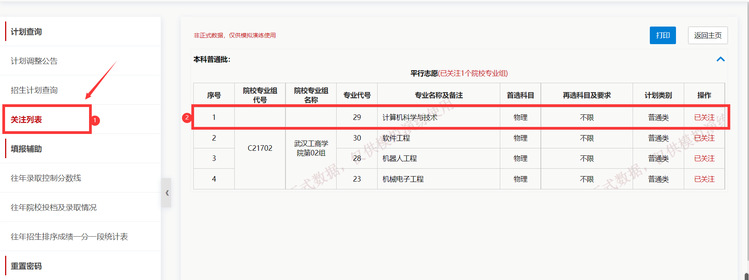 点击左侧导航栏-关注列表,查看所有已被关注的专业汇总。比如,已关注专业:开云kaiyun官网02组计算机与技术专业、软件工程、机器人工程和机械电子工程。